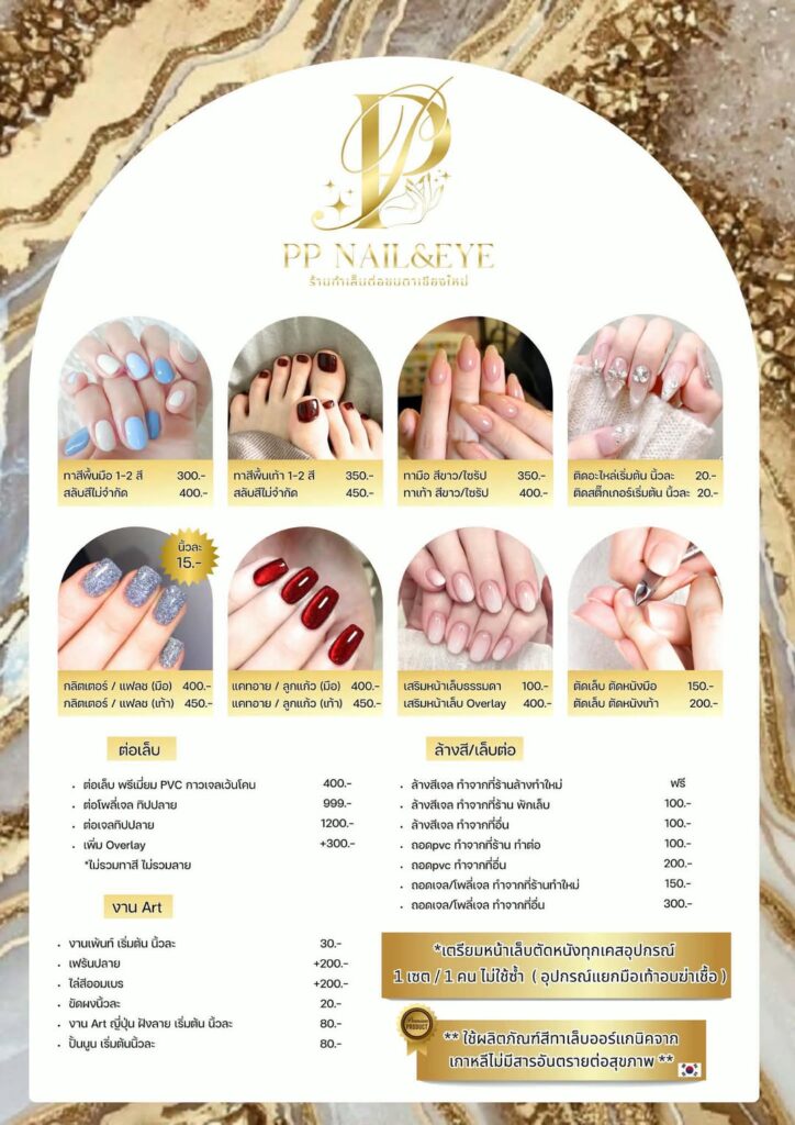ร้านทำเล็บ PP Nail&Eye ร้านทำเล็บต่อขนตาเชียงใหม่ ร้านสวย บรรยากาศดี เราเน้นที่งานบริการ และ เลือกใช้ผลิตภัณฑ์ สีเจลออร์แกนิค แบรนด์ดังจากเกาหลีและอเมริกา izemi bandi dgel ทั้งร้าน ปลอดภัยต่อคนท้องและเด็ก ไม่มีสารอันตราย เพื่อให้ได้ผลลัพธ์ที่คุ้มค่าทั้งความทนทาน และ ความสวยงามปลอดภัยต่อสุขภาพลูกค้า ซึ่งจะให้ความรู้สึกต่างจากสีทาเล็บ ที่ผมสมสารเคมีที่มีความเสี่ยงทำให้เกิดโรค มีกลิ่นเหม็น และ ไม่ทนทำให้หลุดลอกง่าย